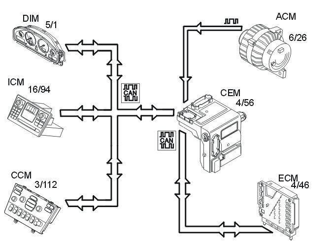 The central electronic module (CEM) also transmits a CAN signal to the driver information module (DIM) (5/1) to light the indicator lamp for high beam.