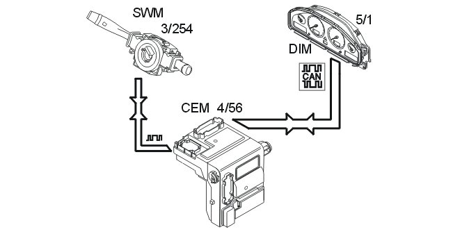 The steering wheel module (SWM) (3/254) transmits data to the central electronic module (CEM) using LIN communication to indicate the selected function. The central electronic module (CEM) (4/56) forwards this data to the driver information module (DIM) via the CAN network.