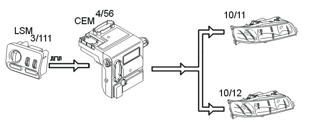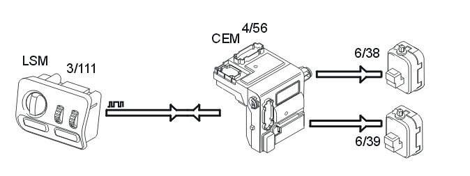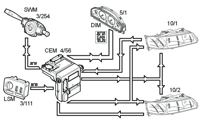 Headlamp range adjustment is controlled by the central electronic module (CEM) (4/56). The central electronic module (CEM) communicates with the light switch module (LSM) (3/111) using serial communication.