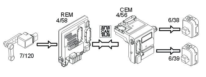 Automatic headlamp range adjustment is controlled by the central electronic module (CEM) (4/56). The position sensor (7/120) on the rear suspension transmits signals to the rear electronic module (REM) (4/58) about the angle of the car in terms of the load conditions.