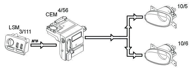 The front fog lamps (10/5-6) are activated by pressing the button for the front fog lamps in the light switch module (LSM) (3/111). The light switch module (LSM) transmits data to the central electronic module (CEM) (4/56) to light the lamps. The central electronic module (CEM) activates the relay and the bulbs are supplied with power via the relay.
