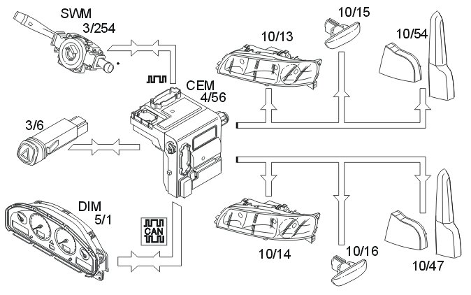 This function is controlled by the left control stalk. The steering wheel module (SWM) (3/254) sends data to the central electronic module (CEM) (4/56) to activate the turn signal lamps via serial communication. The central electronic module (CEM) transmits information to the driver information module (DIM) (5/1) to activate the turn signal indicator and powers the turn signal lamp.