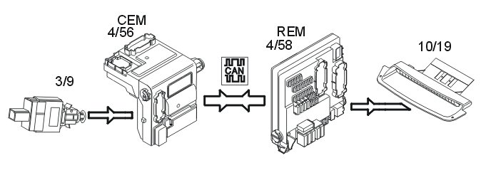 The rear electronic module (REM) transmits this data via the control area network (CAN) to the central electronic module (CEM) which compares the information with the table for the relevant model. The table is stored in the central electronic module (CEM).