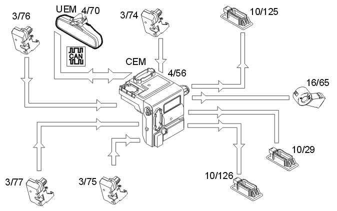 The courtesy lighting (10/125-126), ignition switch (16/65) and glove compartment lighting (10/29) are controlled via the central electronic module (CEM) (4/56). All other interior lighting is controlled by the upper electronic module (UEM) (4/70). (See Design and Function, upper electronic module (UEM)). The central electronic module (CEM) powers the lamps which it controls directly.
