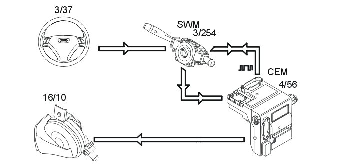 The horn is operated when the steering wheel module (SWM) (3/254) receives a signal from the switches (3/37) in the steering wheel. The steering wheel module (SWM) sends data to the central electronic module (CEM) (4/56) via serial communication indicating that the switch is closed. The central electronic module (CEM) activates the relay for power supply to the horn.