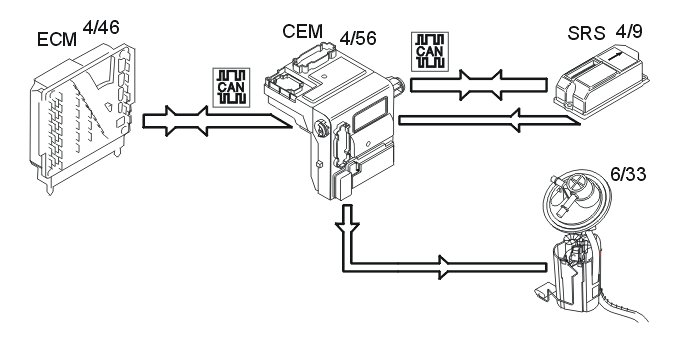 The central electronic module (CEM) (4/56) receives a request from the engine control module (ECM) (4/46) via the control area network (CAN) to start the fuel pump (FP) (6/33). The central electronic module (CEM) then activates the relay which supplies the fuel pump with power.