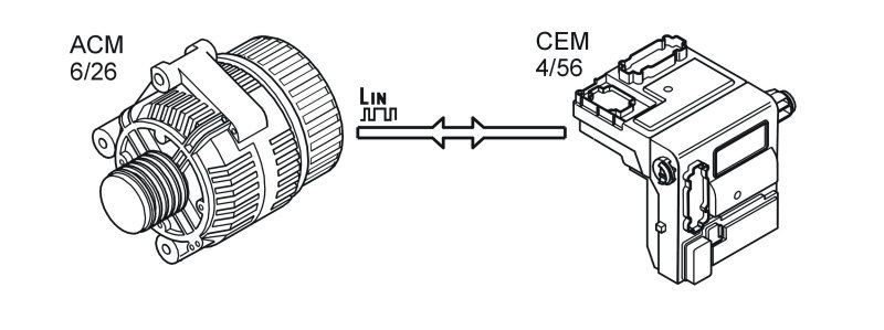 The central electronic module (CEM) (4/56) communicates with the alternator control module (ACM) (6/26) via LIN-communication. In this way the central electronic module (CEM) receives information about how much current the generator produces and how much current can be used for the various loads in the vehicle.