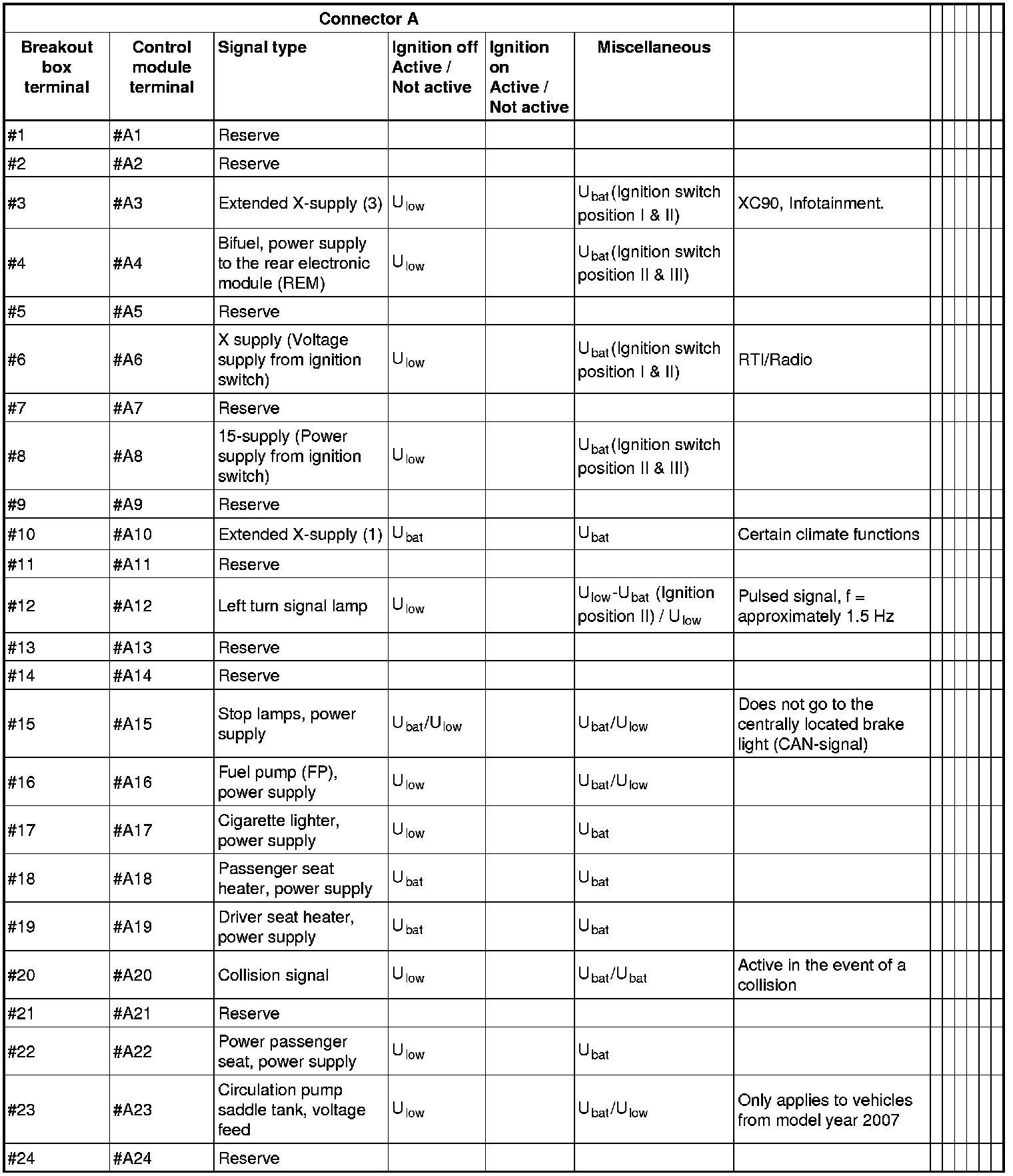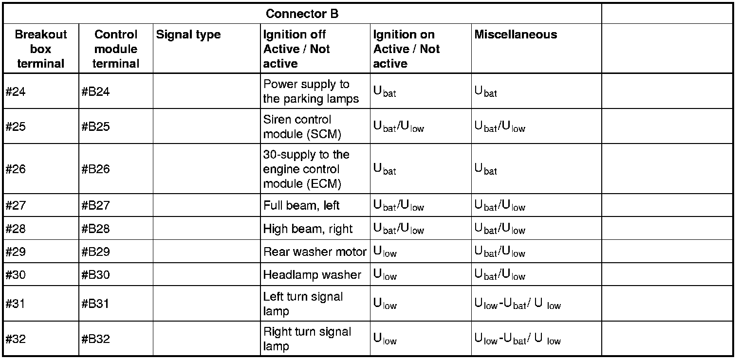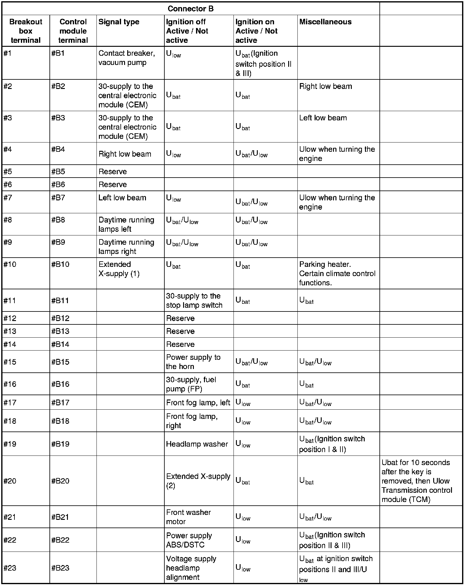 All the values given below are between the terminals stated in column 1 and terminal #D6 in column 2 (power ground). This applies unless otherwise indicated in the last column.