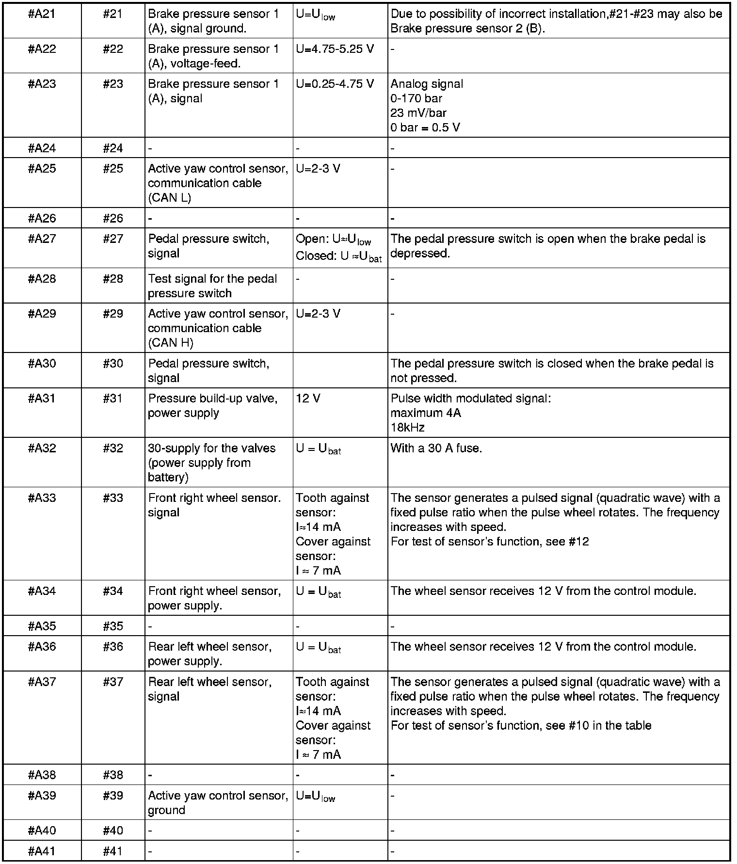 All values given are between the relevant terminal in column 1 and terminal #A16 or #A47 (ground), unless otherwise indicated in brackets.