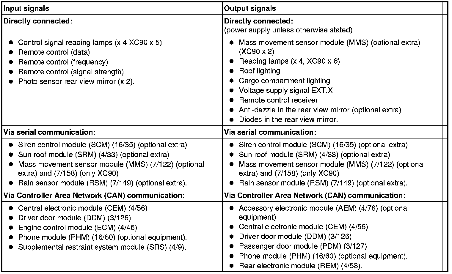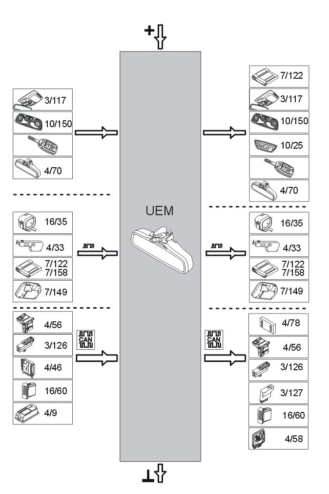 The table below summarizes the input signals to and output signals from the upper electronic module (UEM). The signal types are divided into directly connected signals, serial communication and controller area network (CAN) communication. The illustration below displays the same information with the Volvo component designations.