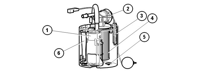 6. Ejector pump, continuously fills the pump housing with fuel. The fuel always flows from the fuel pump through the ejector and back to the pump housing.