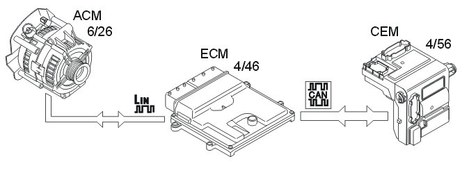 When the ignition key is in position II (or III), the central electronic module (CEM) sends information to the charge regulator (also known as the alternator control module (ACM)) either directly or via the engine control module (ECM).