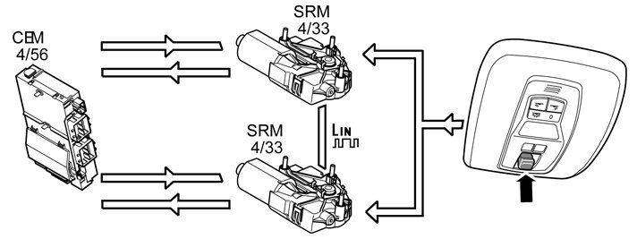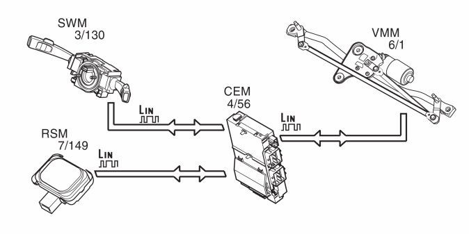 The steering wheel module (SWM) (3/130) transmits the signal via the LIN communication to the central electronic module (CEM) indicating the position of the windshield wiper stalk and the status of the rain sensor switch. If the rain sensor switch is activated on the wiper stalk, the central electronic module (CEM) transmits the information to the rain sensor module (RSM) which is activated.