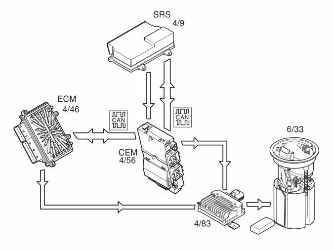 The central electronic module (CEM) (4/56) receives a request to start the fuel pump from the engine control module (ECM) (4/46) via CAN network. The central electronic module (CEM) then activates an internal relay that supplies power to the fuel pump unit (4/83), which in turn powers the fuel pump (6/33).