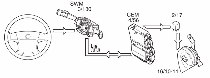 The horn (16/10-11) is located behind the radiator grille. The horn is supplied power from the horn relay (2/17) in the engine compartment fuse and relay box. The horn is activated when a switch in the steering wheel is closed. The closure is detected by the steering wheel module (SWM) (3/130), which sends a signal to the central electronic module (CEM) (4/56). The central electronic module (CEM) forwards a ground closure on one of its outputs, grounding the signal horn relay and activating the relay.