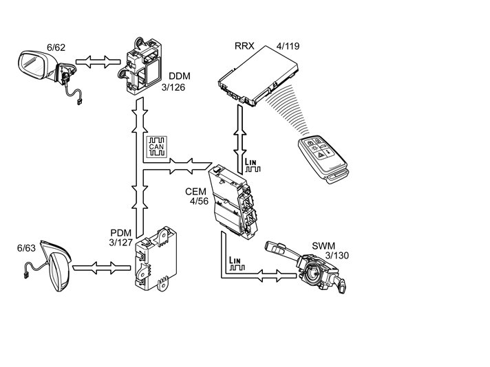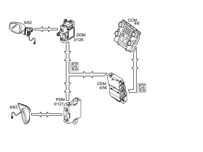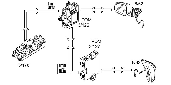 Setting of mirror position is controlled using buttons on the control panel on the driver's side (3/176). The driver door module (DDM) (3/126) transmits a signal directly to the mirror on the driver's side (6/62). When adjusting the mirror on the passenger side (6/63), a signal is sent via the driver door module (DDM) to the passenger door module (PDM) (3/127) on the CAN network. The passenger door module (PDM) transmits the signal to the door mirror.