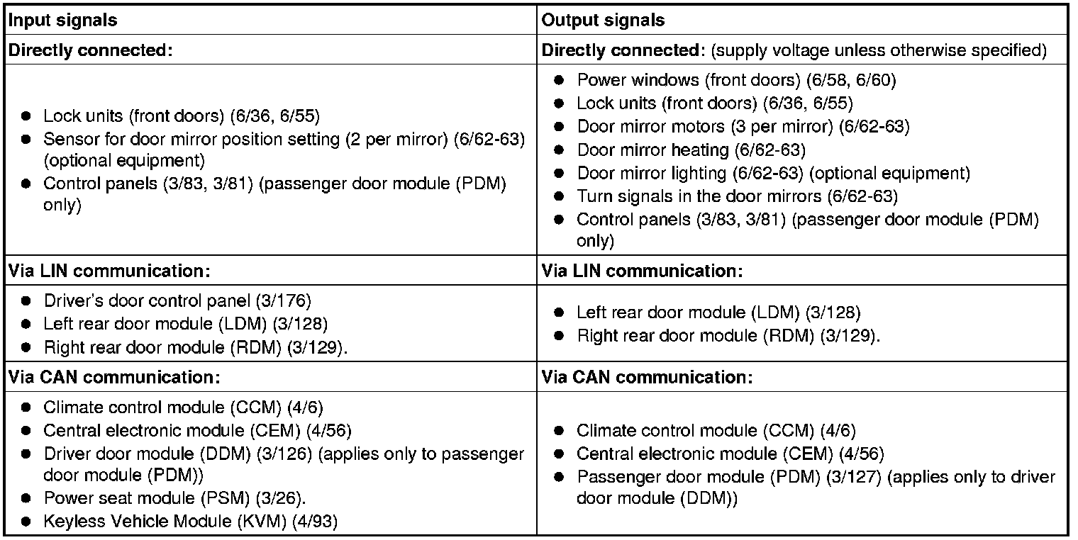 The table below summarizes the input signals to and output signals from the driver door module (DDM) and passenger door module (PDM). The signal types are divided into directly connected signals, LIN and CAN communication. The illustration below displays the same information with the Volvo component designations.