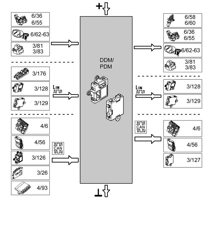 Driver door module (DDM) and Passenger door module (PDM) communicate with Left rear door module (LDM) and Right rear door module (RDM) on each side of the vehicle via LIN-communication.