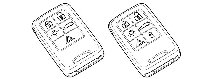 The remote key has a different appearance depending on which equipment the vehicle has. The inner design also differs between the two models depending on whether it has functions for keyless entry or not. The remote key also contains a key blade. The key blade is normally retracted inside the remote key. The blade is used as a standby option to open the vehicle should there be a fault in the system.