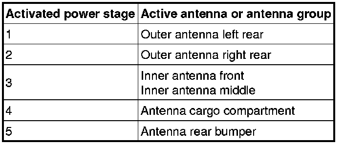 The keyless vehicle module (KVM) contains five power stages. The control module uses these relays to select the antennas to be activated. See the table below: