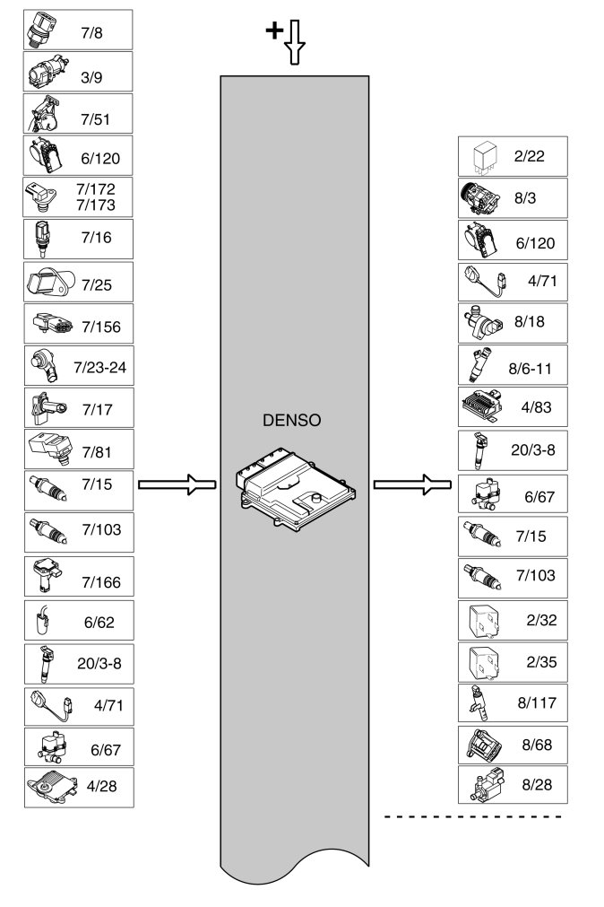 Functions which require battery power (Ubat) and high output are controlled by external or internal power stages. For example ignition coils have external power stages (integrated into the ignition coils) while the power stages for the injectors are integrated in the engine control module (ECM).