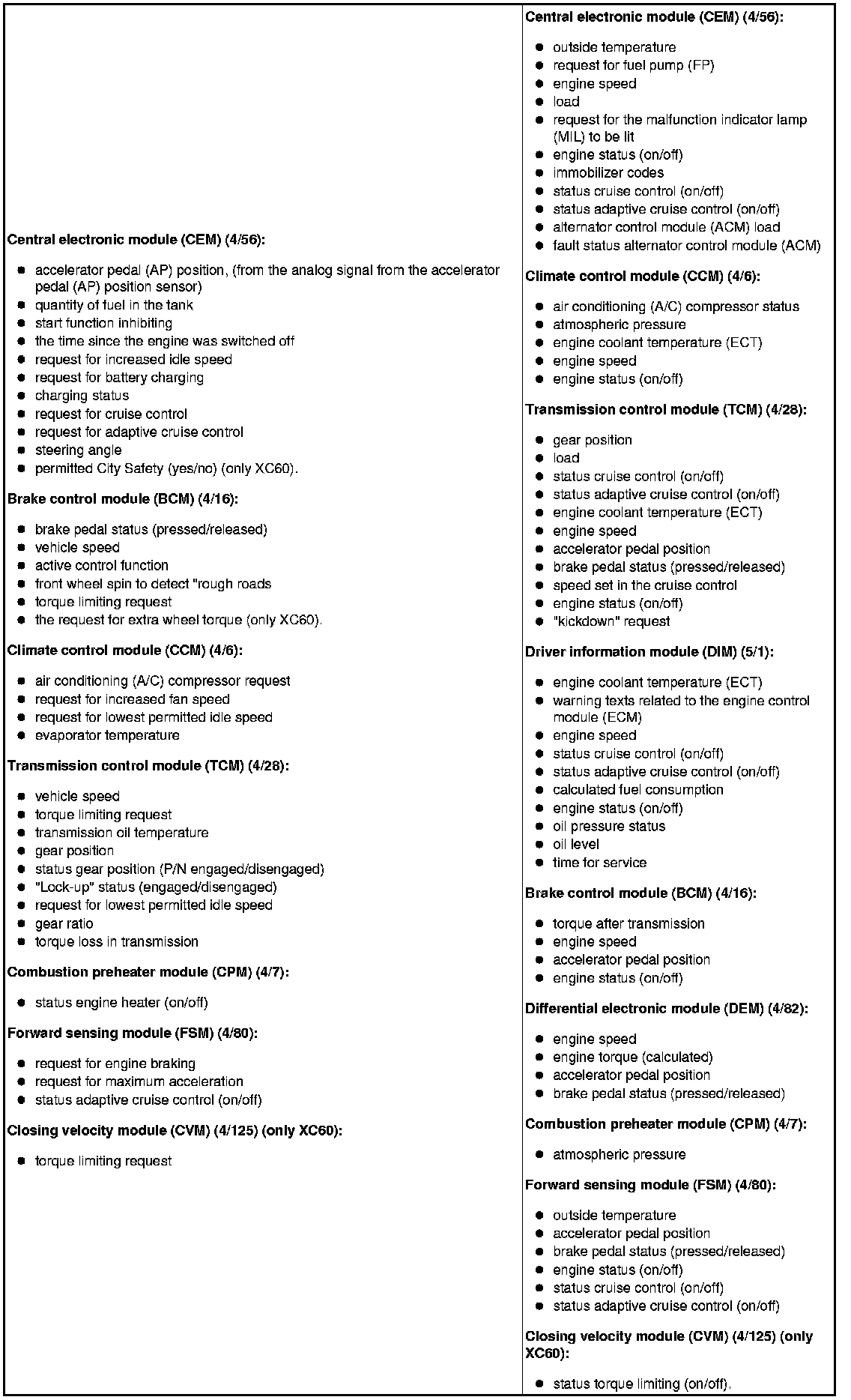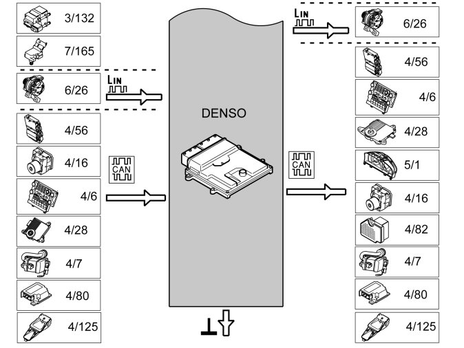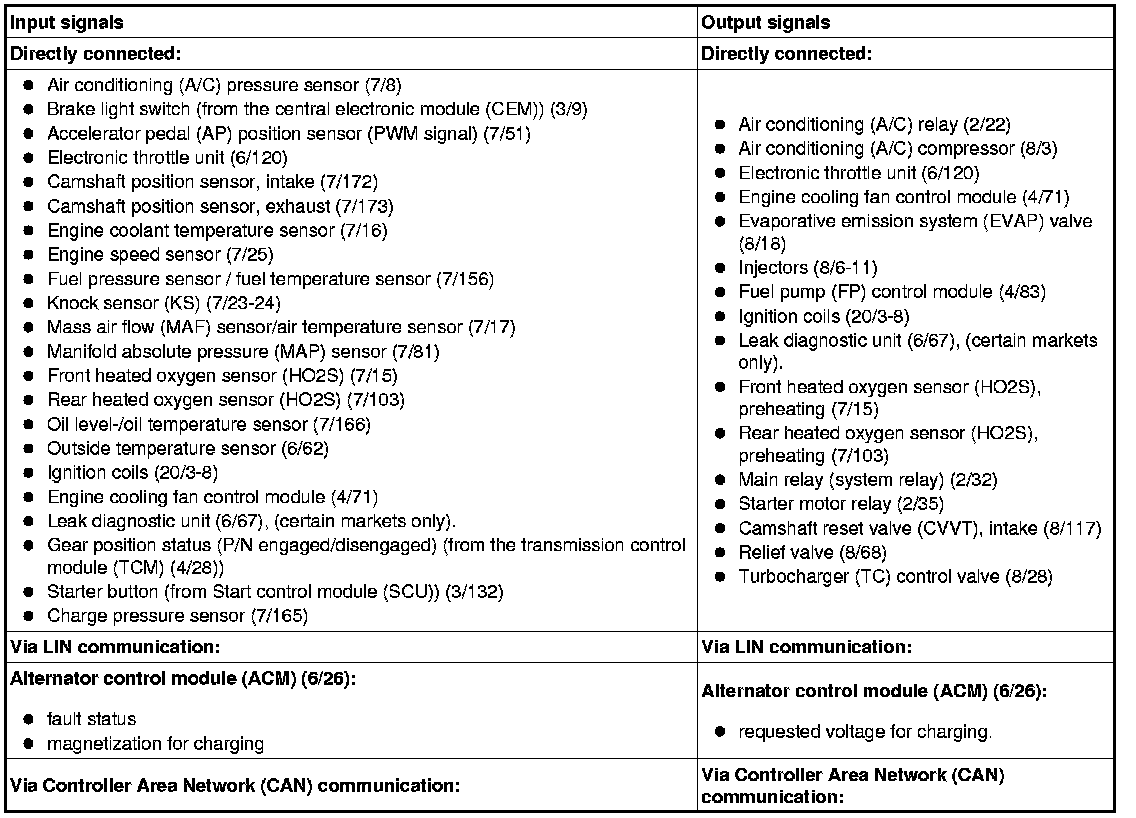 The table below summarizes the input signals to and output signals from the Engine Control Module (ECM). The signal types are divided into directly connected signals, LIN and CAN communication. The illustration below gives the same information as the Volvo component designations.