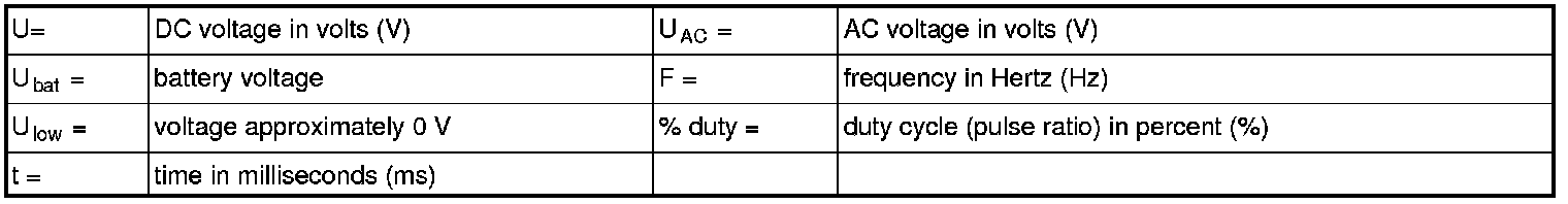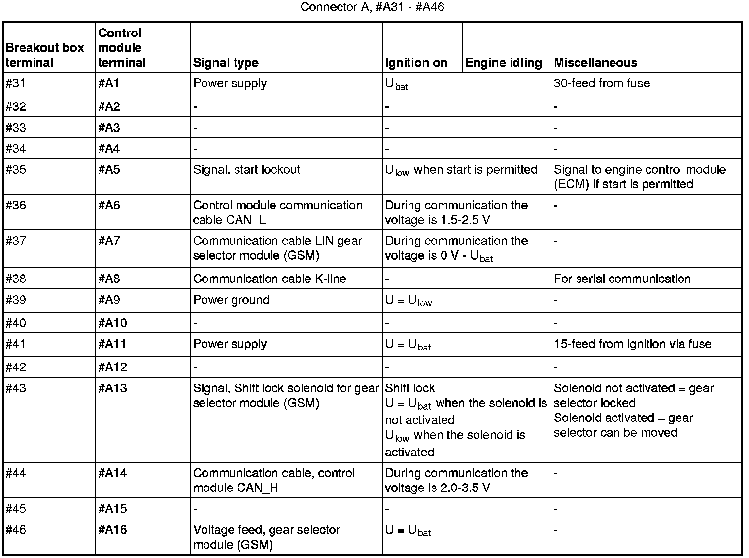 All values indicated below are between respective connection in column 1 and #A9 (#39 on the breakout box). If this is not the case, it is indicated within brackets.