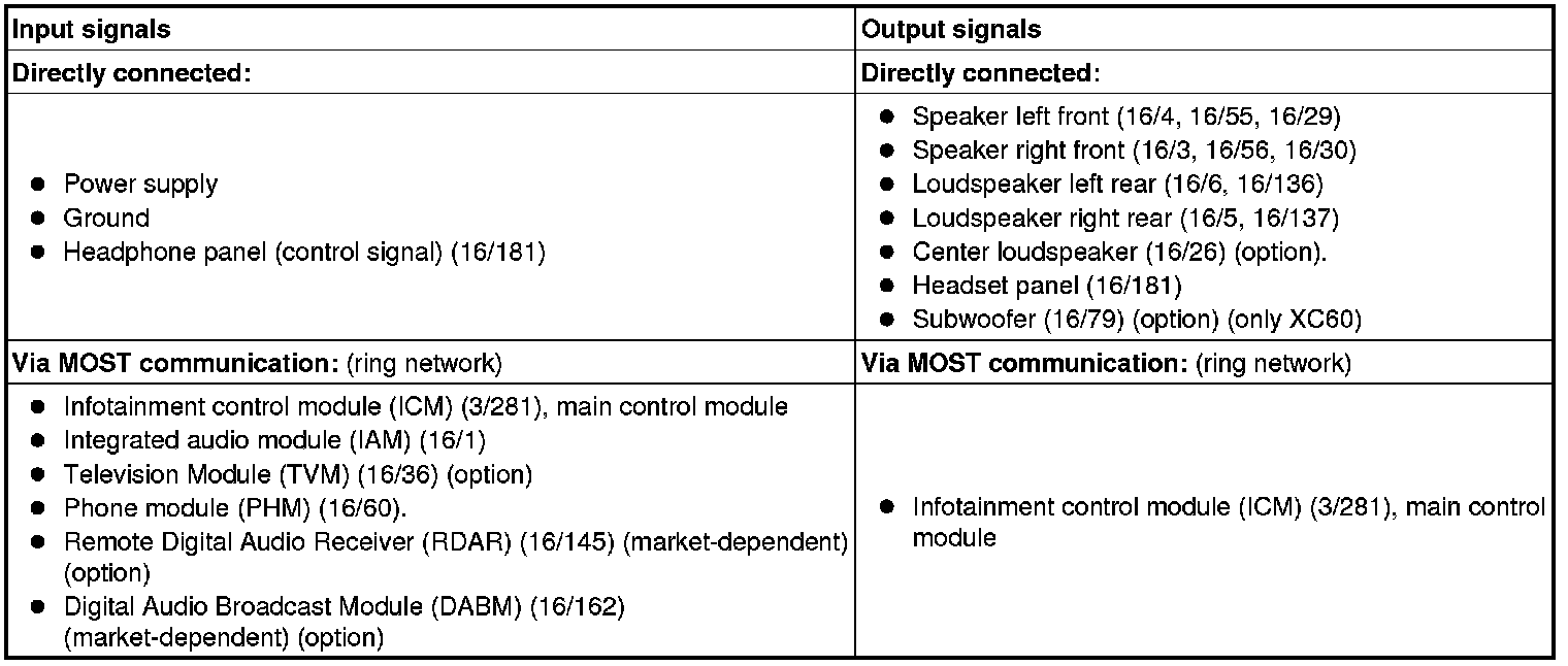 The table below summarizes the input signals to and output signals from the audio module (AUD). The signal types are divided into directly connected signals and MOST communication. The illustration below displays the same information with the Volvo component designations.