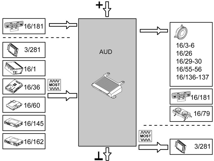 The audio module (AUD) communicates with directly connected components and with other control modules and components via the MOST network, a fiber optic network used for communication.