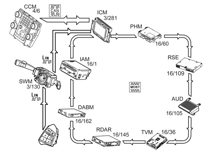 The signals from the steering wheel buttons are transmitted to the steering wheel module (SWM) (3/130) with LIN communication. The steering wheel module (SWM) transmits the signals on to the Infotainment Control Module (ICM) (3/281) using LIN communication. The infotainment control module (ICM) in turn transmits the signals on to the affected control module on the MOST network.