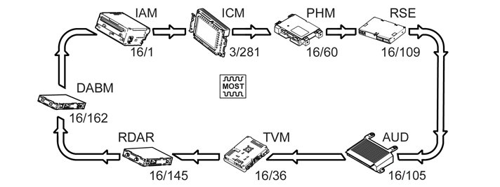 If a control module is not in the stored list, it is disconnected from the MOST network and the functionality of this control module is blocked. This means that control modules in the MOST network cannot be moved from one vehicle to another.