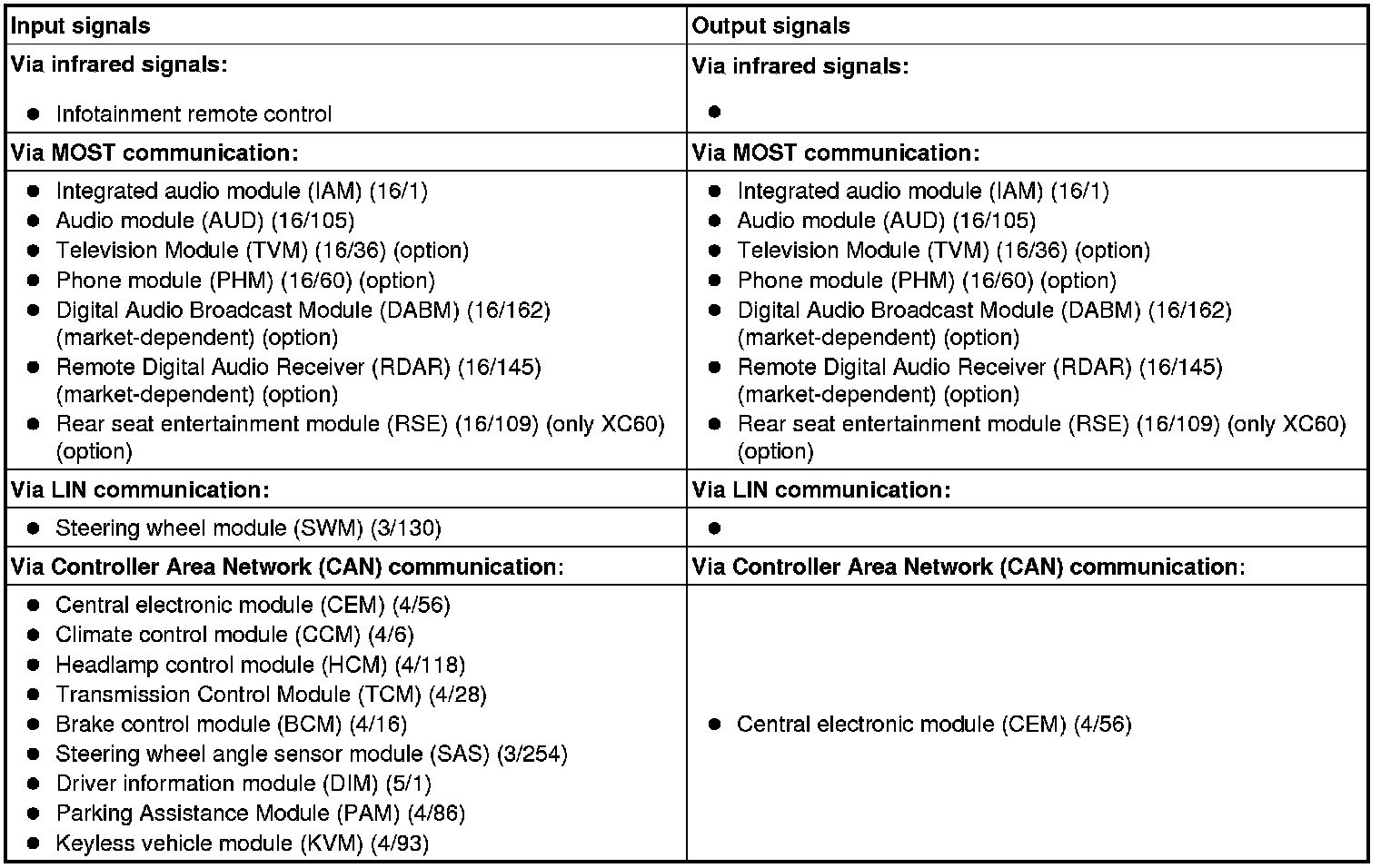 The table below summarizes the input signals to and output signals from the Infotainment Control Module (ICM). The signal types are divided into directly connected MOST-communication, LIN-communication, and CAN- communication. The illustration below displays the same information with the Volvo component designations.