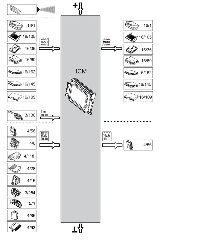 The infotainment control module (ICM) acts as a gateway between the CAN and MOST networks. It also acts as the master control module in the MOST network and checks the other control modules.