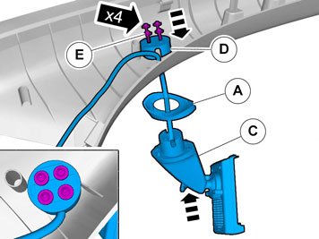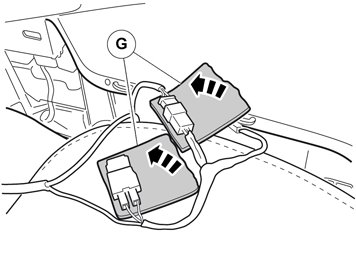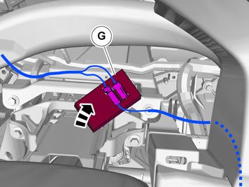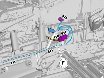 - Take the cable harness (F) out of the kit and place it on the left hand side of the tunnel console.