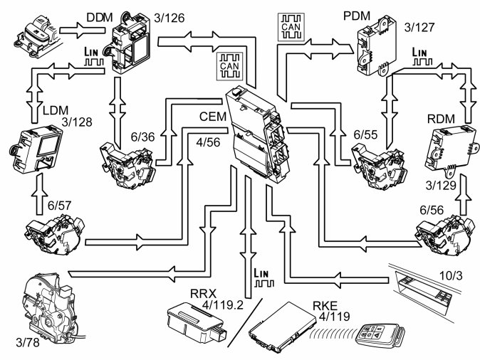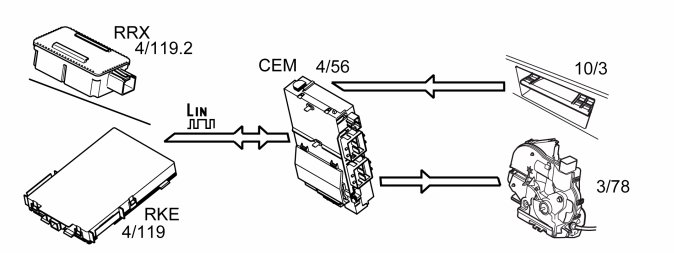 Note! The market in Japan has Remote Keyless Entry (RKE) for model year 2008-2009 regardless of whether the vehicle is equipped with keyless entry system or not. When the vehicle is not equipped with keyless entry system, the Remote Keyless Entry (RKE) communicates directly with Central electronic module (CEM).