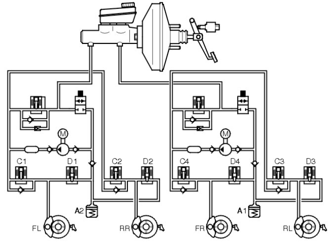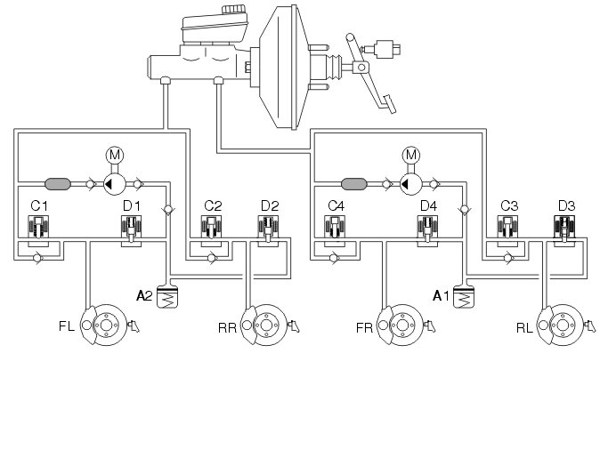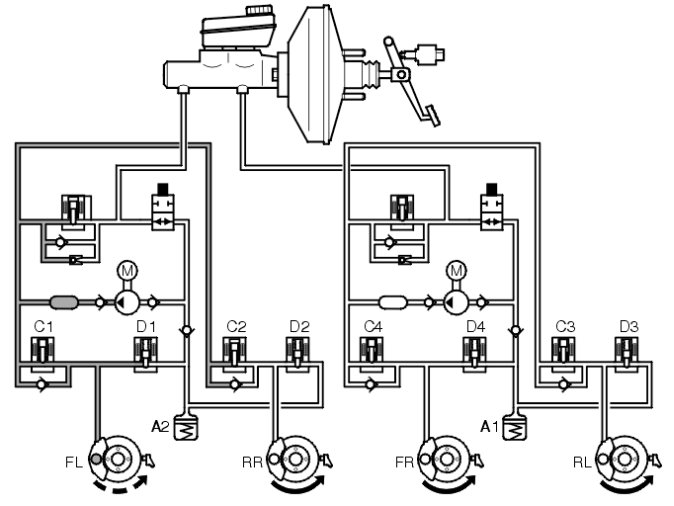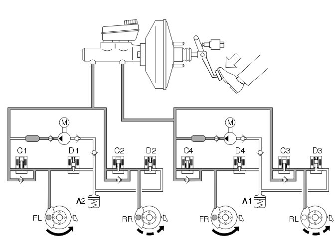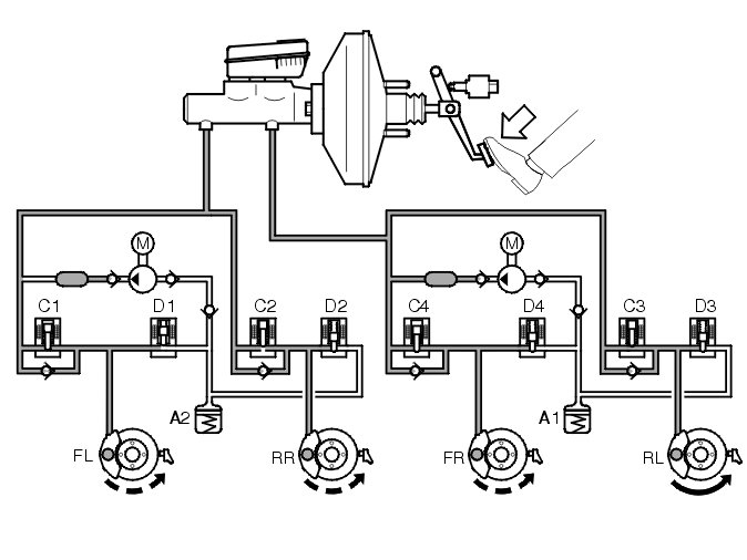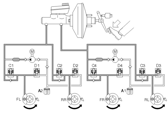 If the wheel still tends to lock up, the outlet valve is opened in order to release brake fluid back to the accumulators, resulting in a reduction in the pressure in the brake circuit (pressure dumping, see left front wheel -FL). This reduces hydraulic pressure as well as brake force, resulting in wheel acceleration. The hydraulic pump returns brake fluid from the accumulators to the master cylinder.