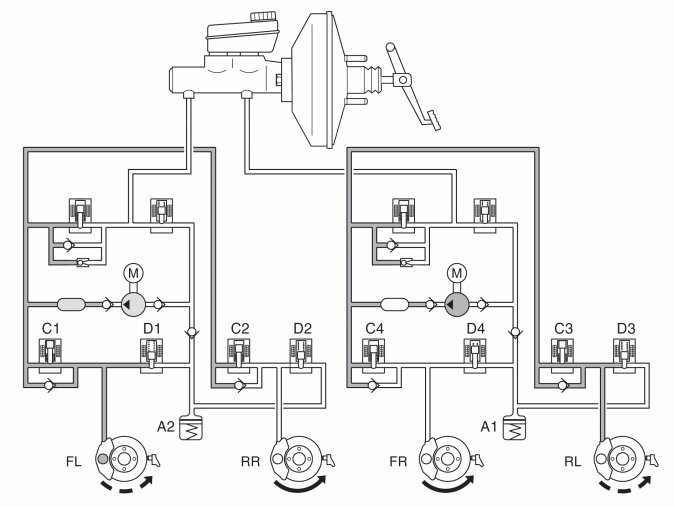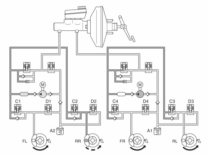 In the example above, the steering wheel was turned to the right, but the vehicle tends to continue straight ahead. The SV valve (separation valve) closes, the ESV valve (electronic shuttle valve) opens and the pump starts. The DSTC system applies the brakes to the right rear wheel by leaving intake valve C2 open and closing the other intake valves (C1, C3 and C4).