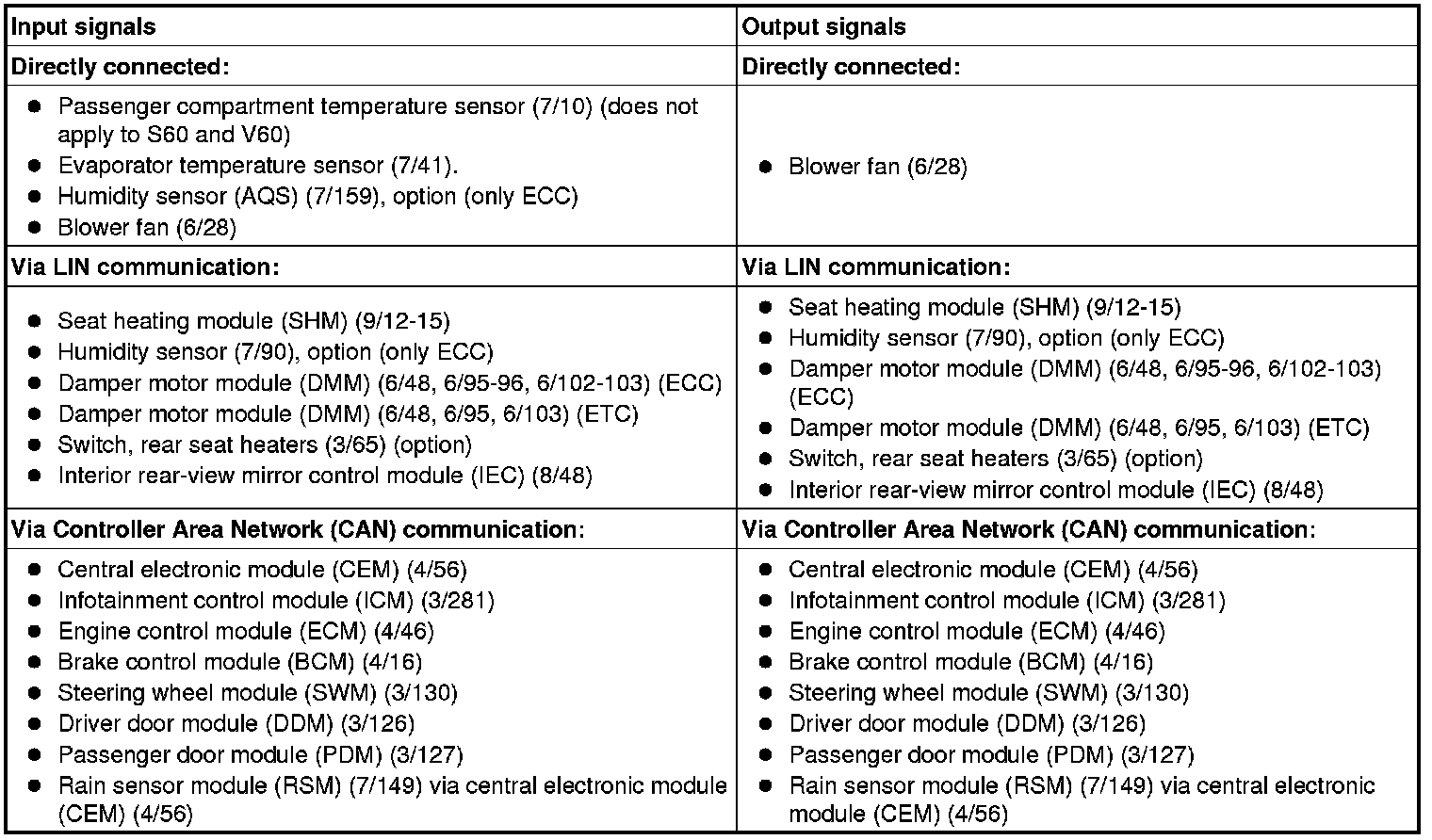 The table below summarizes the input signals to and output signals from the climate control module (CCM). The signal types are divided into directly connected signals, LIN and CAN communication. The illustration below displays the same information with the Volvo component designations.