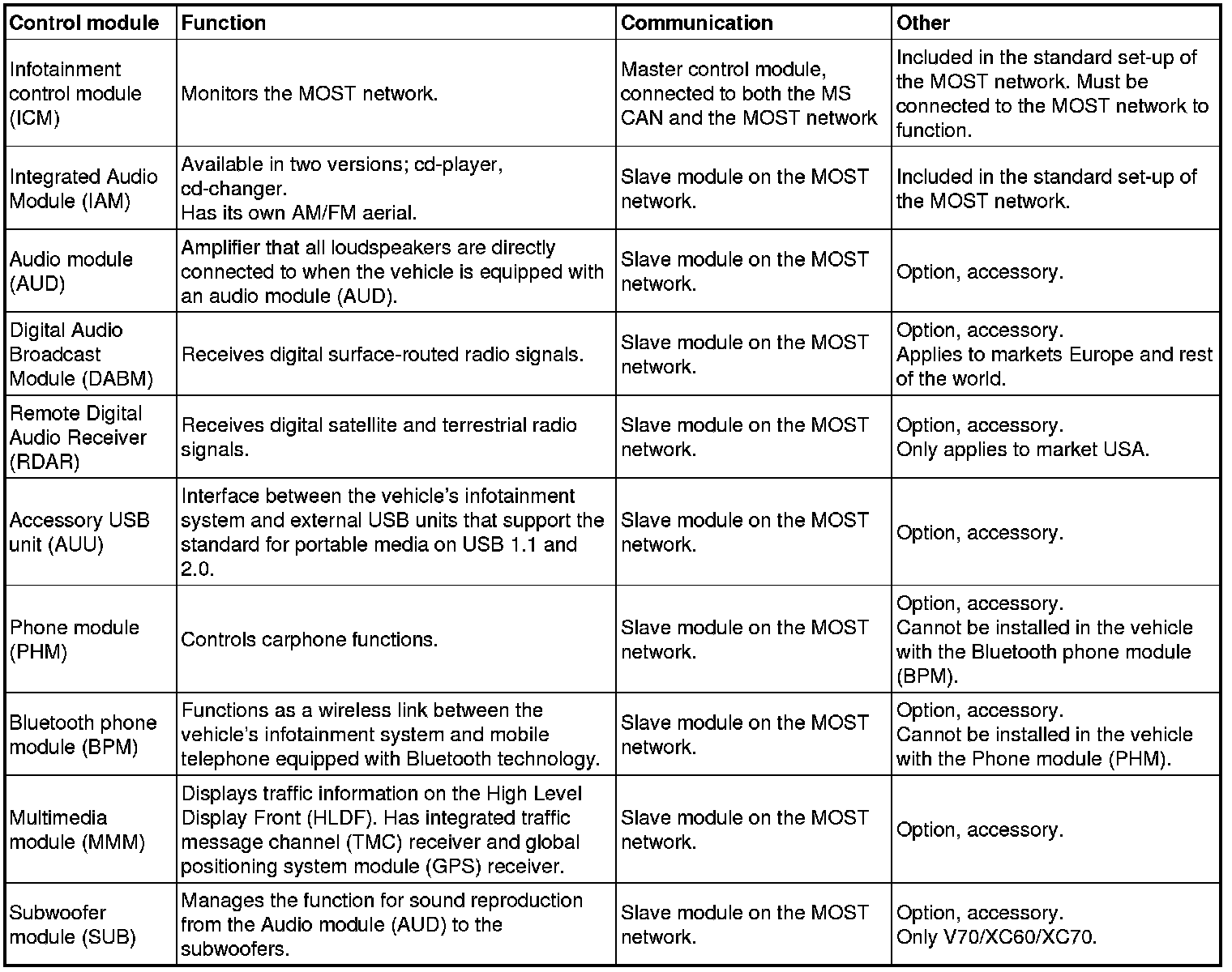 The table below lists all the control modules which may be included in the MOST network.
