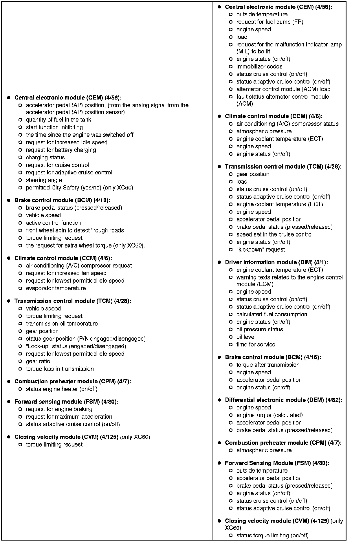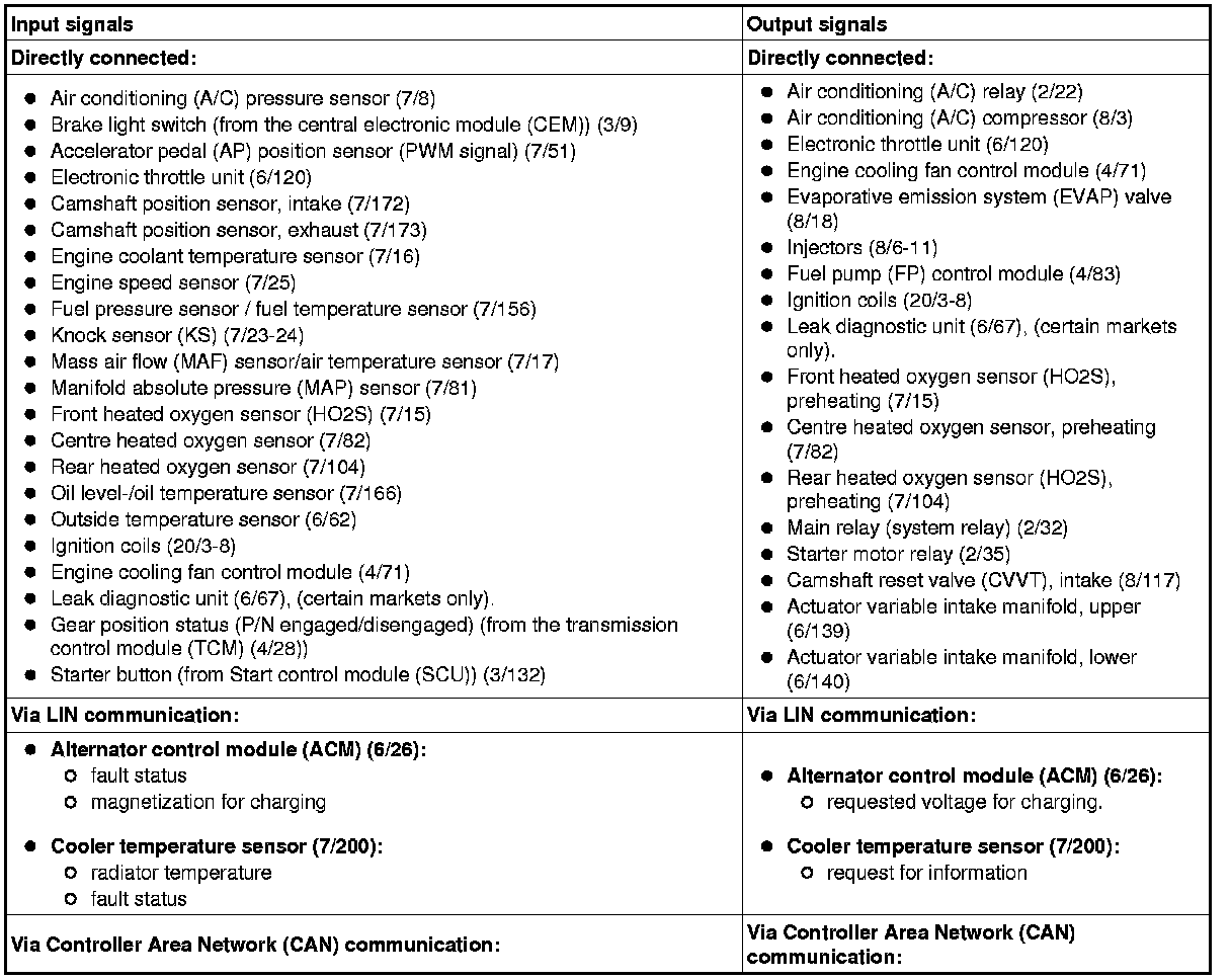The table below summarizes the input signals to and output signals from the Engine Control Module (ECM). The signal types are divided into directly connected signals, LIN and CAN communication. The illustration below gives the same information as the Volvo component designations.