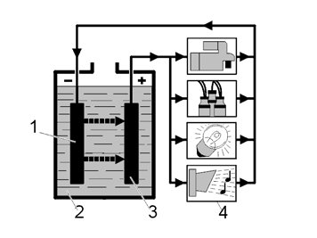 The battery consists of several cells. Schematically, a battery can be said to be made up of two electrodes, one positive and one negative. These electrodes are different materials, which are submerged in a container filled with electrolyte, often called battery acid. As a result of the different electrode materials, there is an electrical charge between the positive and negative electrodes. There is a chemical reaction between the electrodes and the electrolyte causing electrical energy to be generated. If the positive and the negative poles of the electrodes are connected to form a closed circuit, a current flows through the circuit.