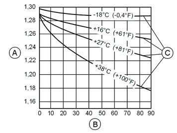 The illustration shows an example of how quickly a battery (of open type) can self-discharge, depending on the temperature of the battery. Note how the density of the acid reduces with time and how the self-discharge speeds up as the temperature increases. For an explanation of the density of the acid, see Acid density.