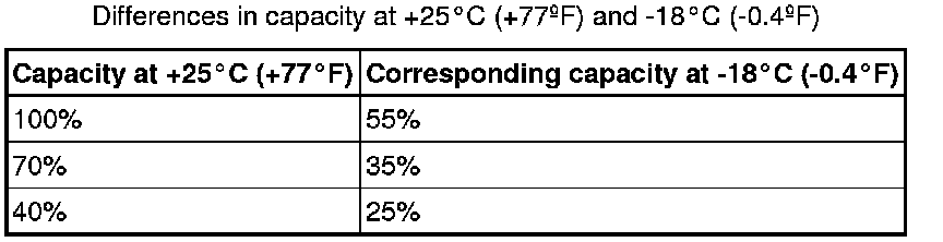 The table shows the difference in capacity in a battery at +25°C (+77°F) and -18°C (-0.4°F).
