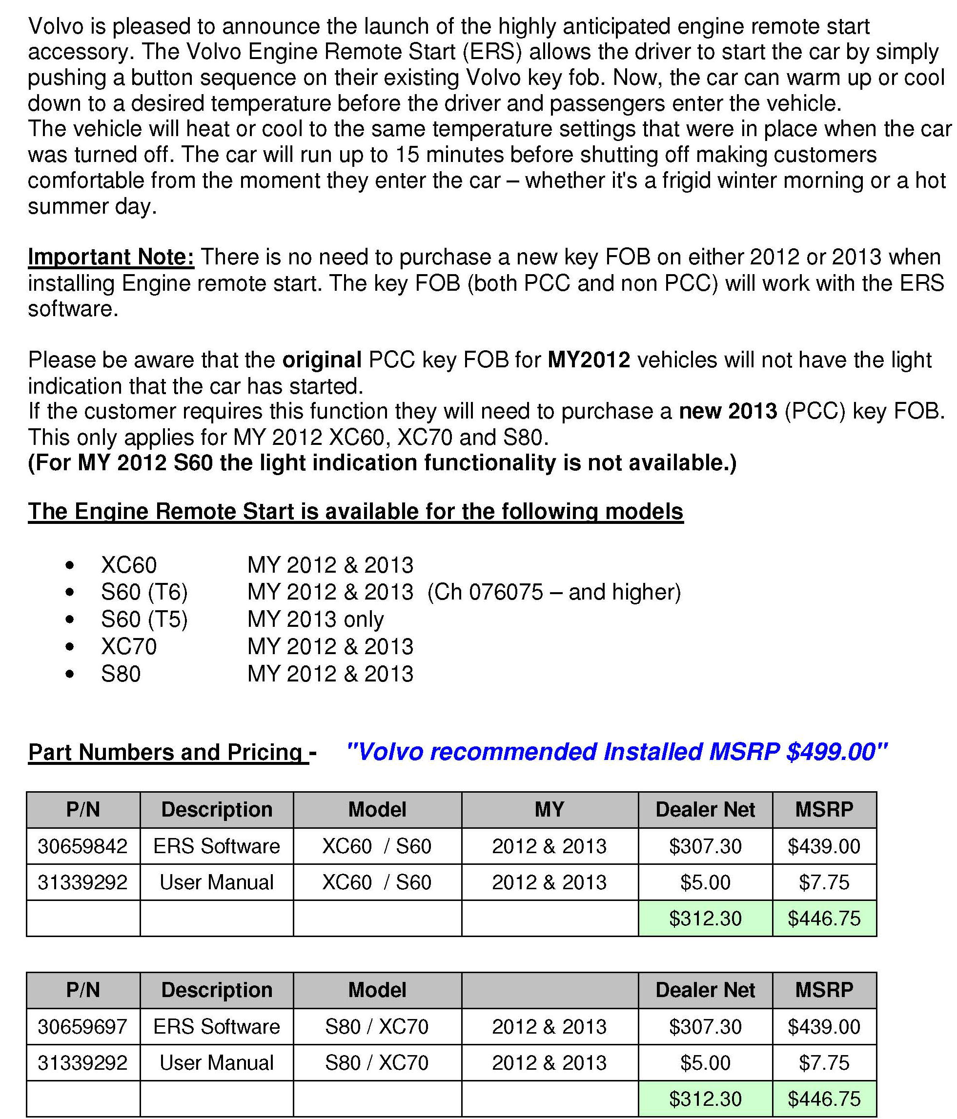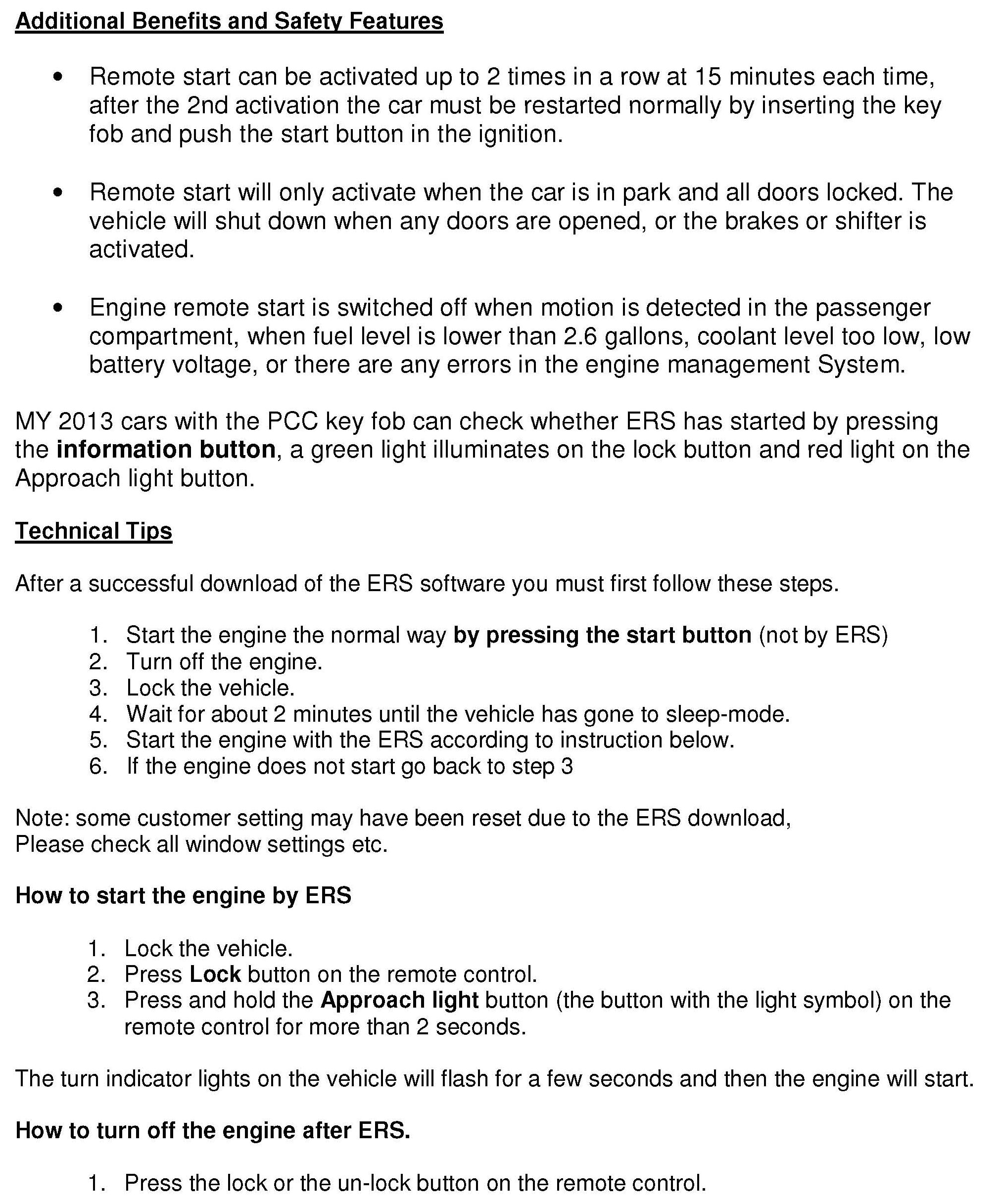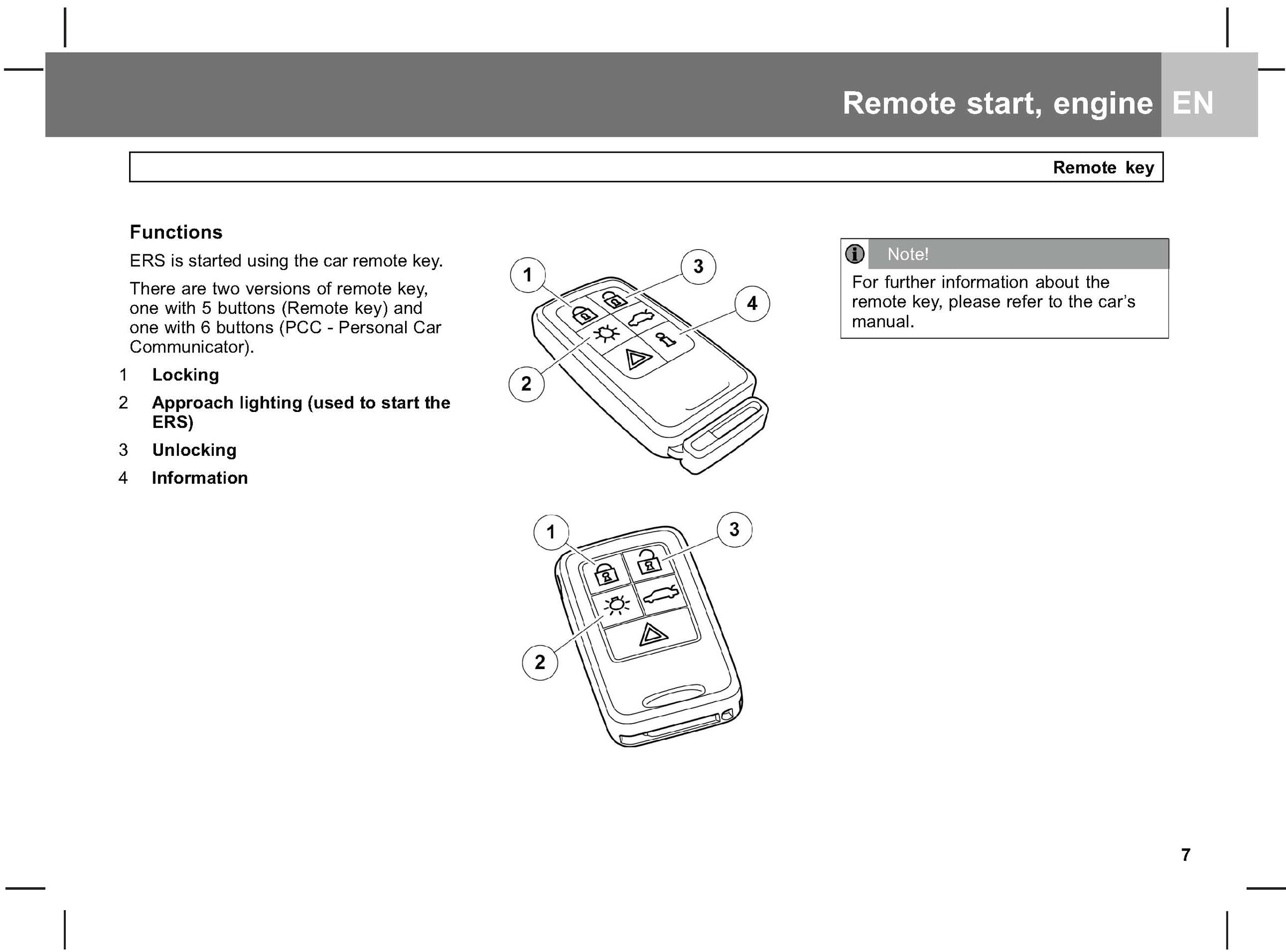 For PCC remotes, the user can check whether ERS has started by pressing the Information button. If ERS has started, a light illuminates on the button for Approach lighting and the lock button. This function is available on model year 2013 remotes but not model year 2012 remotes. This function can be enabled on 2012 XC60/XC70/S80 vehicles by replacing the original remotes with 2013 remotes. This function can not be enabled on 2012 S60 vehicles.