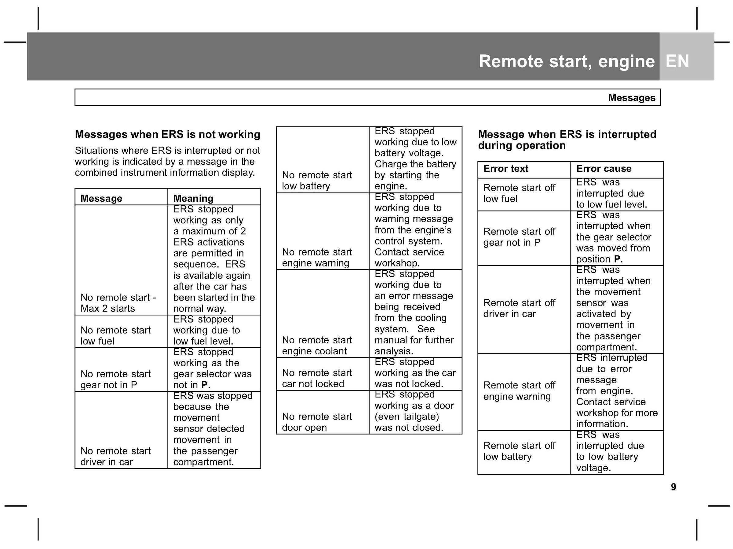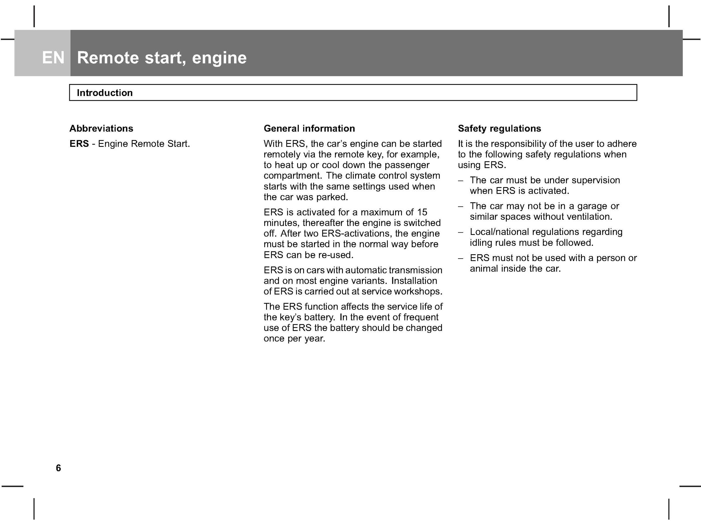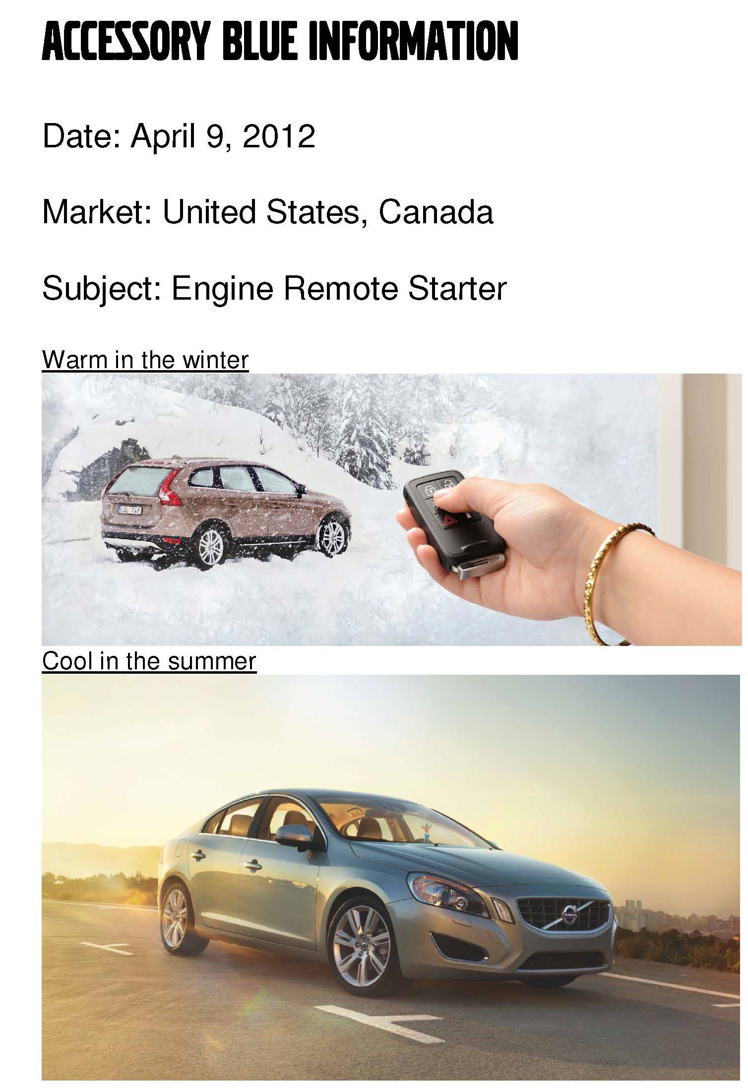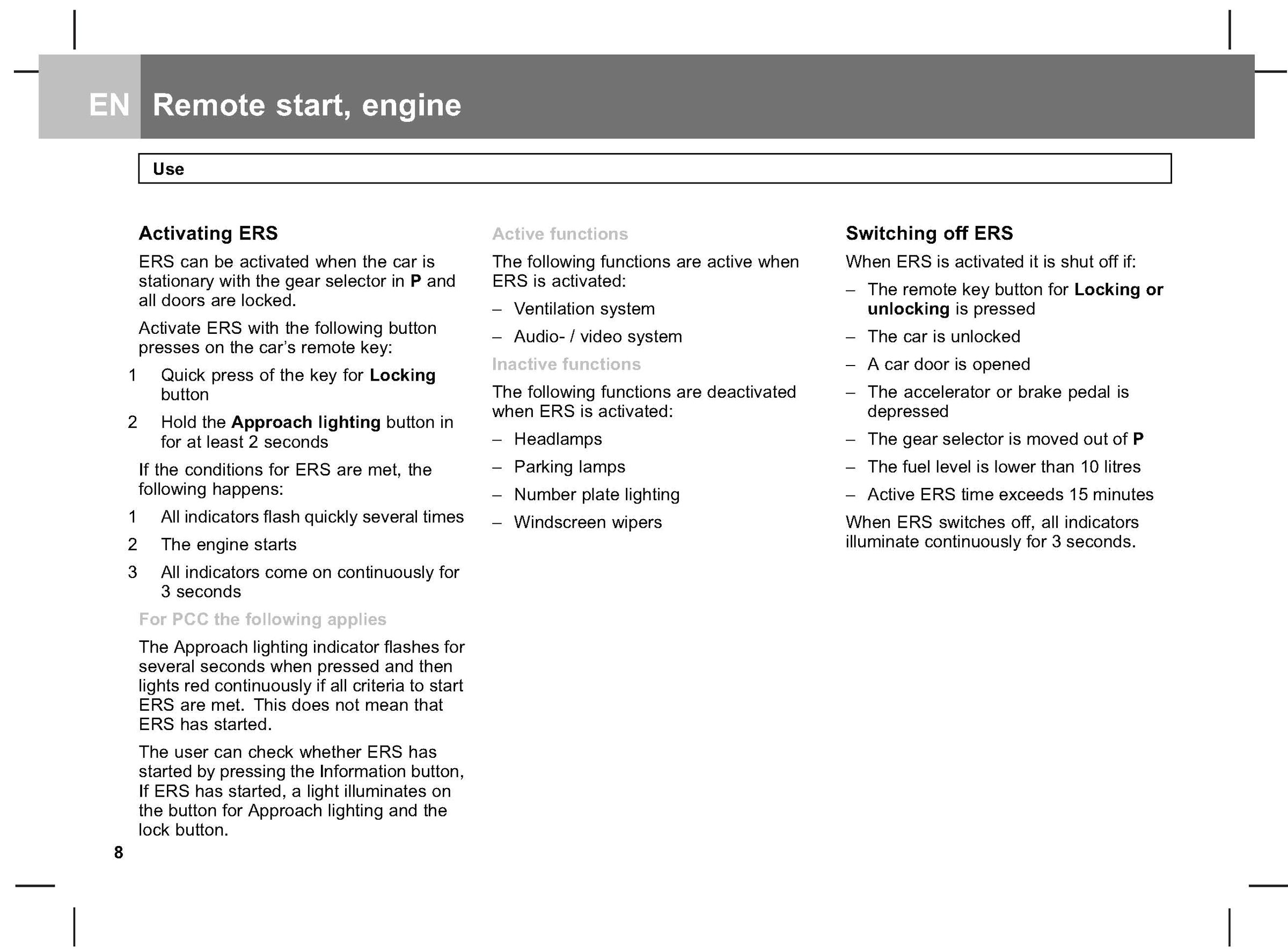 For PCC remotes, the user can check whether ERS has started by pressing the Information button. If ERS has started, a light illuminates on the button for Approach lighting and the lock button. This function is available on model year 2013 remotes but not model year 2012 remotes. This function can be enabled on 2012 XC60/XC70/S80 vehicles by replacing the original remotes with 2013 remotes. This function can not be enabled on 2012 S60 vehicles.
