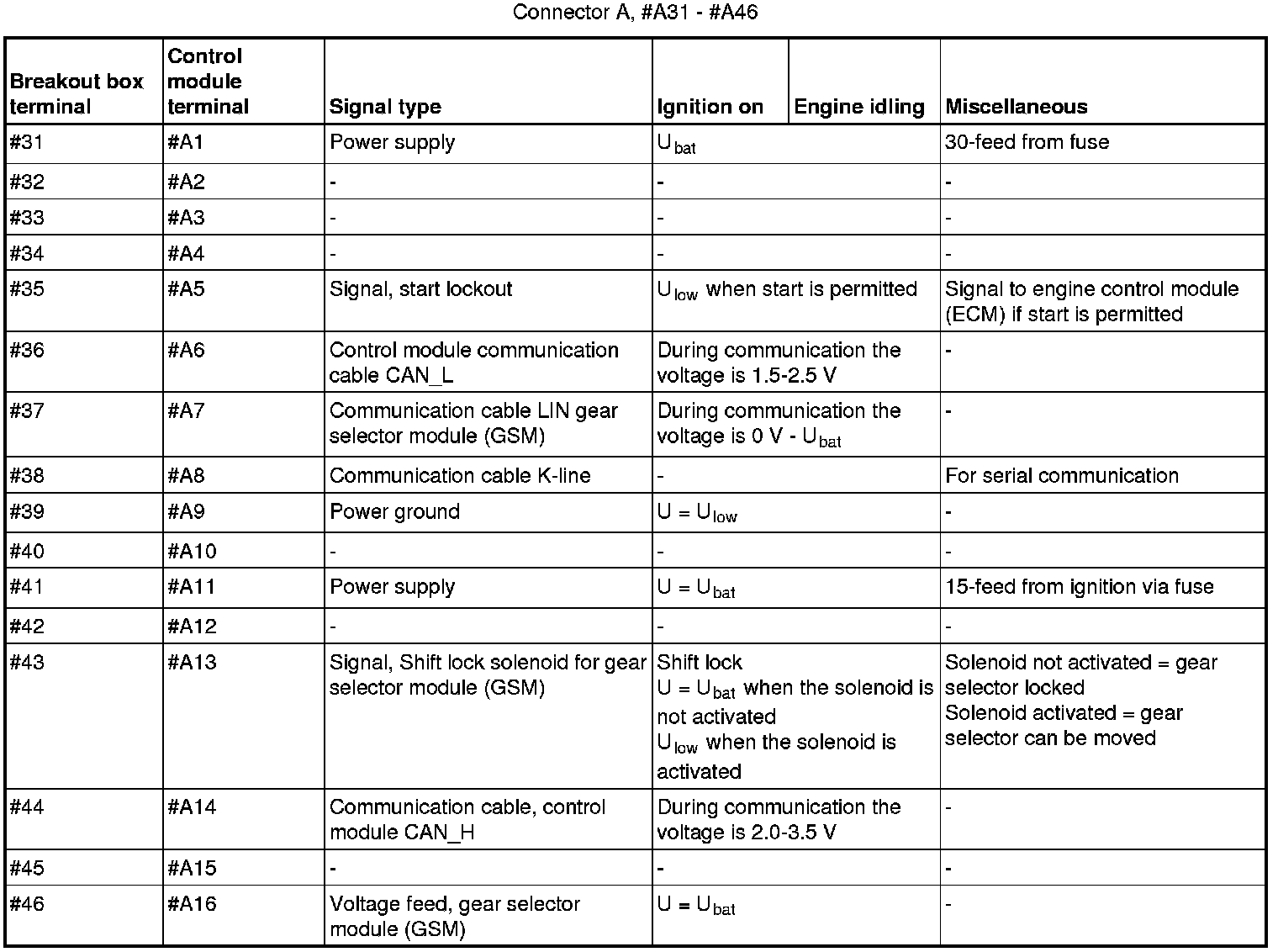 All values indicated below are between respective connection in column 1 and #A9 (#39 on the breakout box). If this is not the case, it is indicated within brackets.