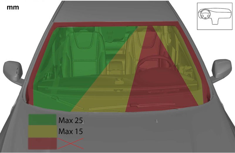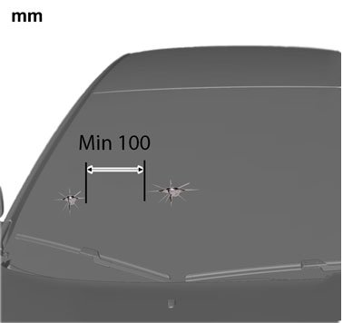 Minimum distance between damaged areas in the pane of glass is 100 mm.