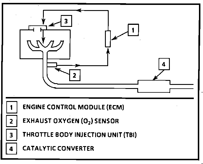 The Electronic Control Module (ECM) is located in the passenger compartment and is the control center of the Computer Command Control (C3) system. The ECM constantly receives information from various sensors. The computer performs the diagnostic functions of the system. The computer can recognize operational problems and alert the driver through the "SERVICE ENGINE SOON" light. The computer stores a trouble code which identifies the problem area to diagnose and repair. The computer is designed to process the various input information, and send the necessary electrical response to control fuel delivery, spark control, and other emission control systems. The computer used in these vehicles is a type called GMP4. The computer can control these devices through the use of Quad Driver Modules (QDM). When the ECM is commanding a device or a component "ON," the voltage potential of the output is "LOW" or near zero volts. When the ECM is commanding a device or component "OFF," the voltage potential of the circuit will be "HIGH," or near 12 volts. The primary function of the QDM is to supply the ground for the component being controlled. The input information has an interrelation between sensor output. If one of the input devices failed, such as the oxygen sensor, this could affect more than one of the systems controlled by the computer.