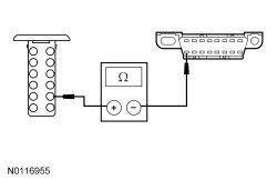 - Measure the resistance between the FCDIM (Front Control/Display Interface Module) C2123-4, circuit VDB06 (GY/OG), harness side and the DLC (Data Link Connector) C251-1, circuit VDB06 (GY/OG), harness side.