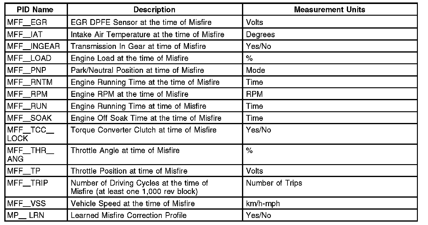 Some unique PIDs are stored in the keep alive memory (KAM) of the powertrain control module (PCM) to help in diagnosing the root cause of misfires. These PIDs are collectively called misfire freeze frame (MFF) data. These parameters are separate from the generic freeze frame data stored for every MIL code and are used for misfire diagnosis only. The MFF data could be more useful for misfire diagnosis than the generic freeze frame data. It is captured at the time of the highest misfire rate, not when the DTC is stored at the end of a 200 or 1,000 revolution block (generic freeze frame data for misfire can be stored minutes after the misfire actually occurred).